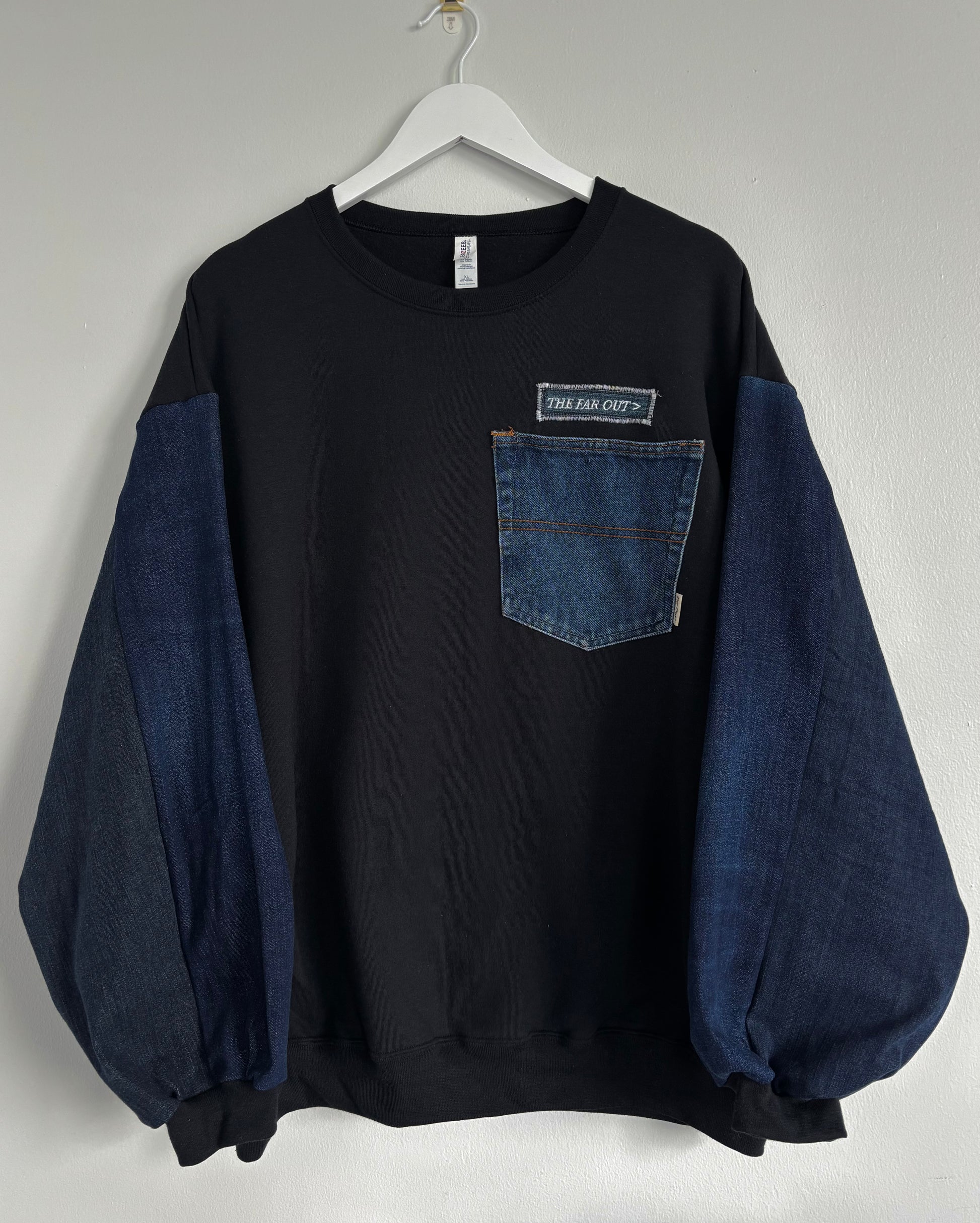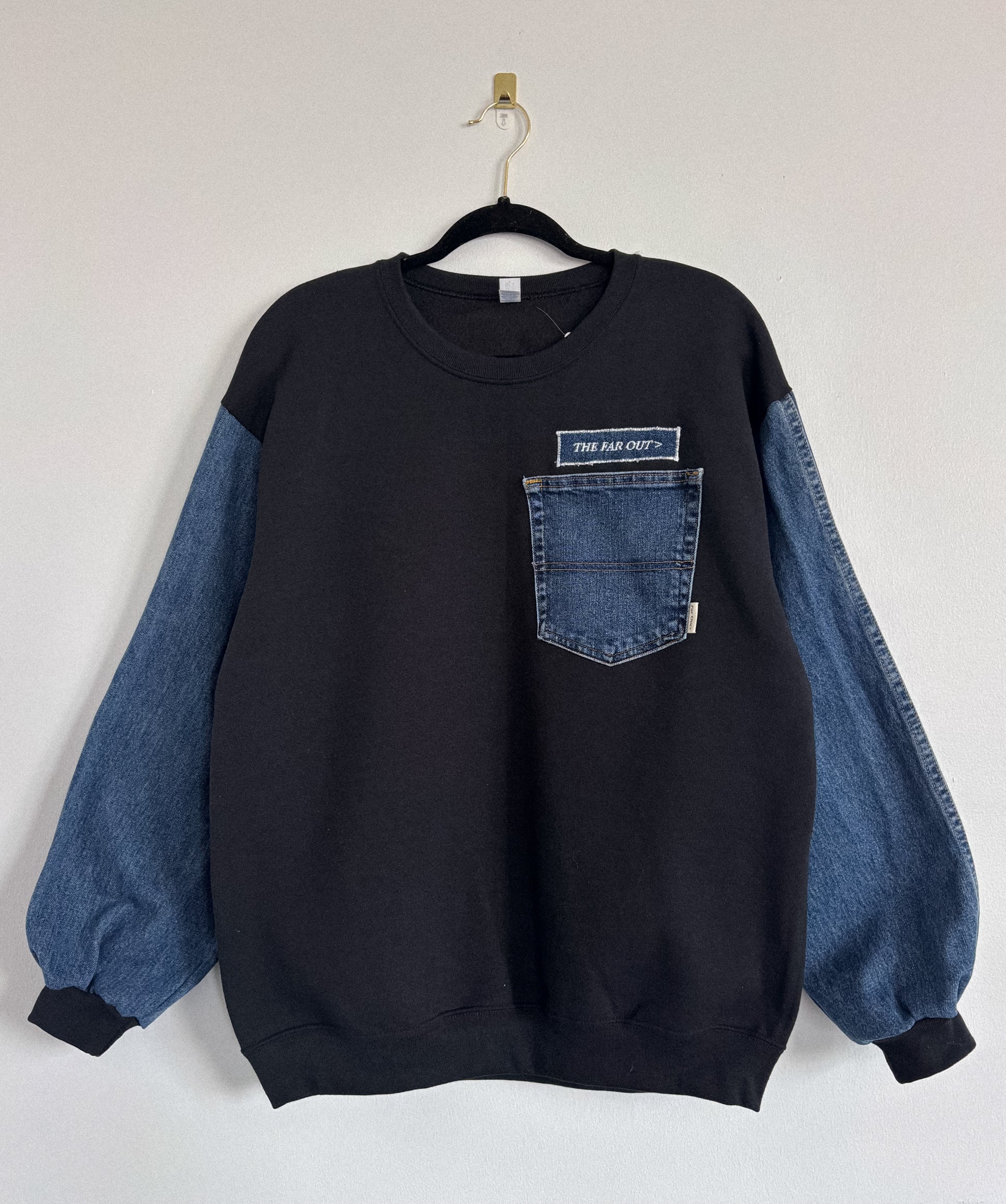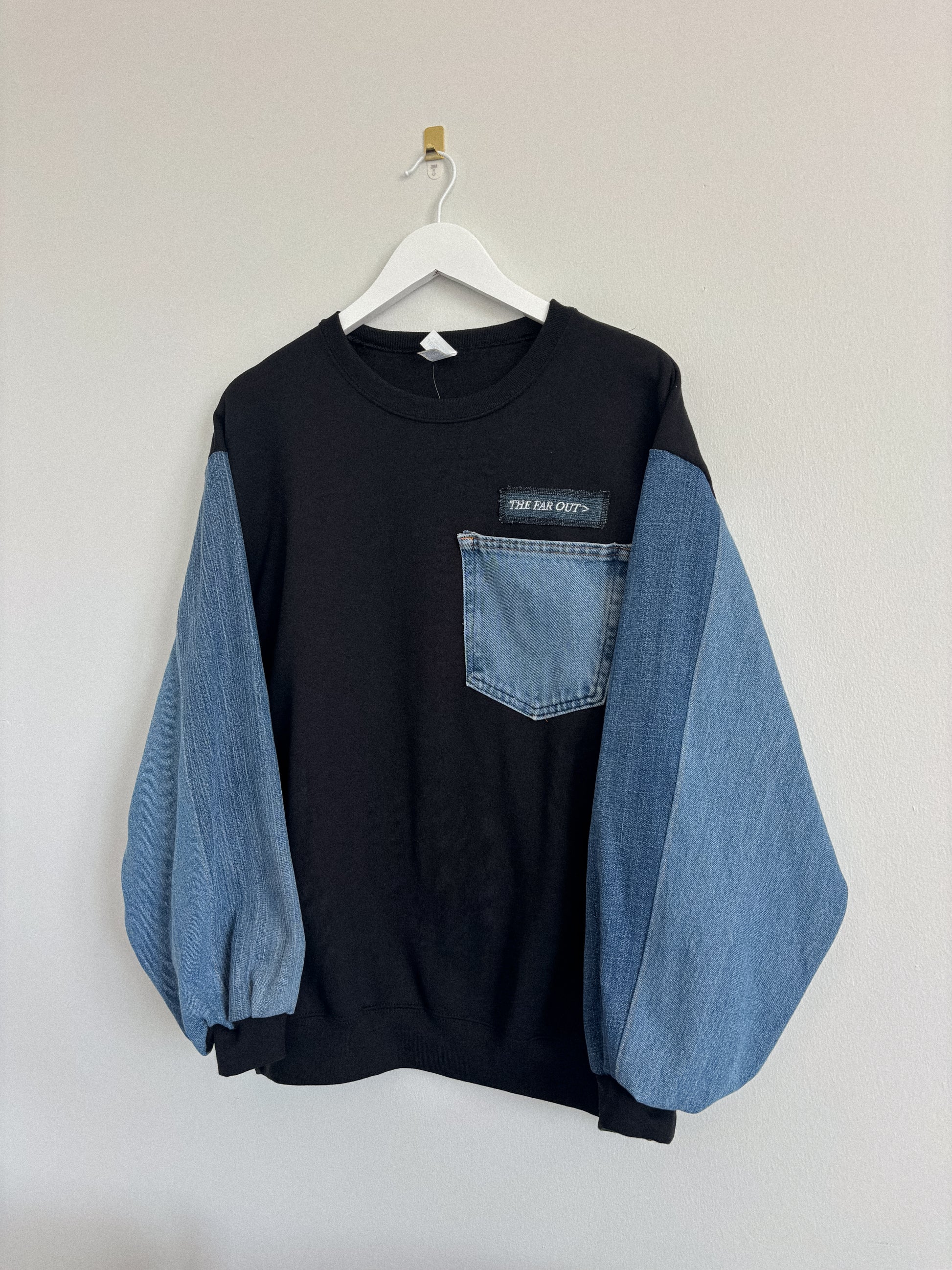 One of a kind- Black crewneck featuring denim sleeves and a denim pocket. Sleeve design is oversized. Perfect for a staple everyday wear